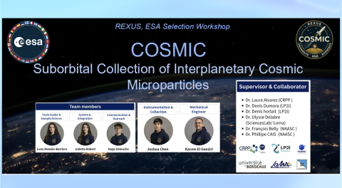 Le projet COSMIC, pour Collecte Suborbitale de Microparticules Interplanétaires Cosmiques, est un projet expérimental que nous développons à l’Université de Bordeaux dans le cadre du programme européen REXUS/BEXUS. Notre objectif est de concevoir un dispositif capable de collecter, sans contamination, des microparticules dans la mésosphère, afin d’en analyser la composition, dans une zone de l’atmosphère encore largement méconnue.